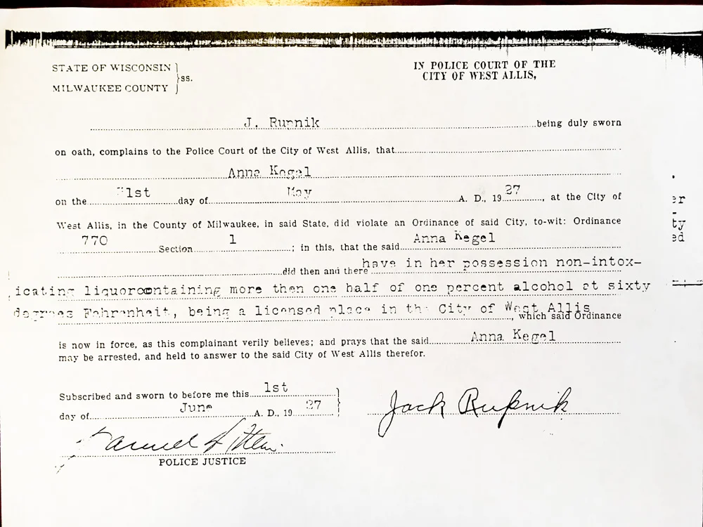 With a little bit of luck and an expensive lawyer, Anna, and the future of Kegel's Inn was saved from the fate of so many of the other soda pop parlors in the area. As luck would have it, Wisconsin ended its official enforcement of prohibition in 1928 and their establishment was spared. Her arrest ticket is pictured below.